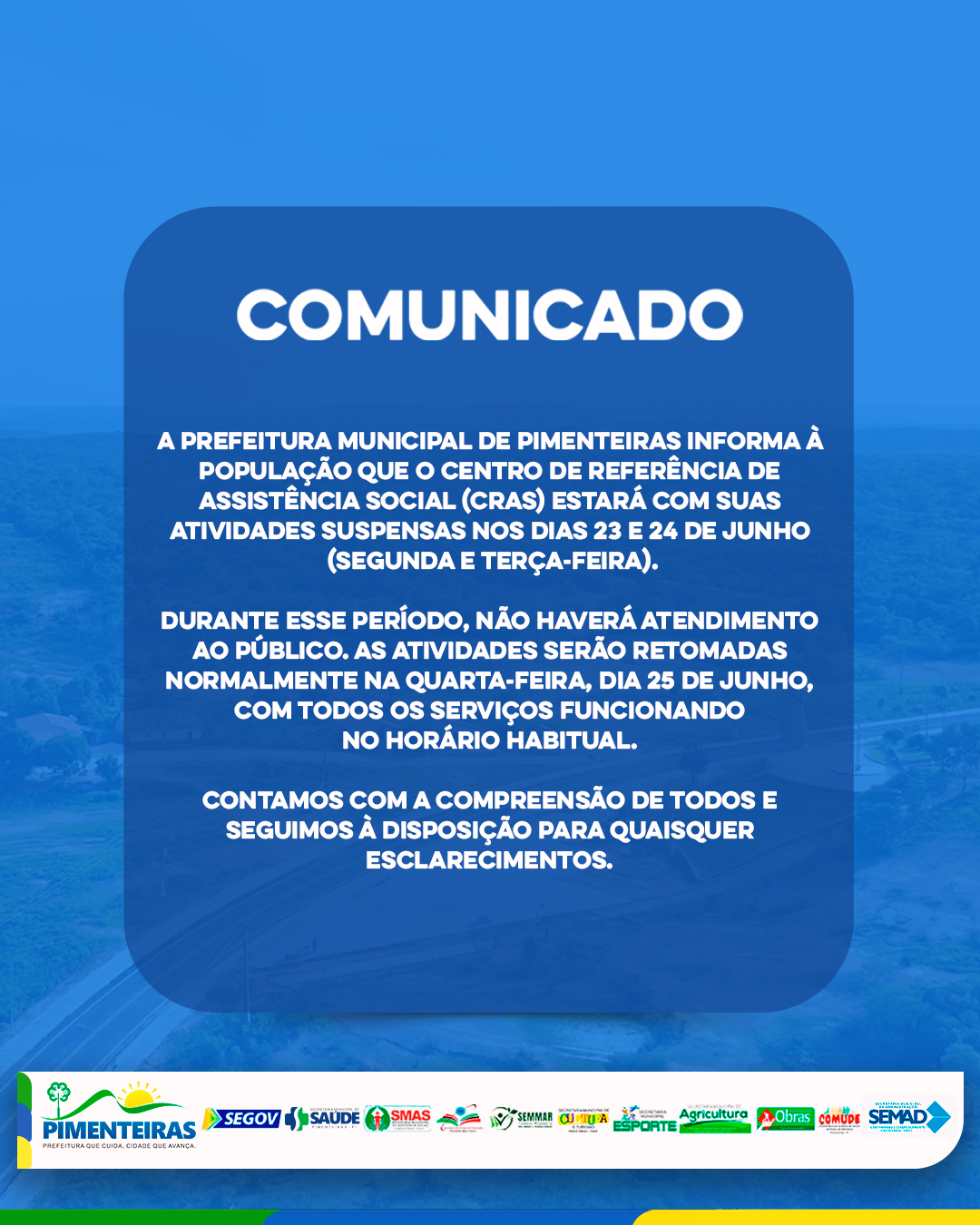 Data: 23/06/2025A Prefeitura Municipal de Pimenteiras informa que o Centro de Referência de Assistência Social (CRAS) estará com suas atividades suspensas nos dias 23 e 24 de junho, segunda e terça-feira.