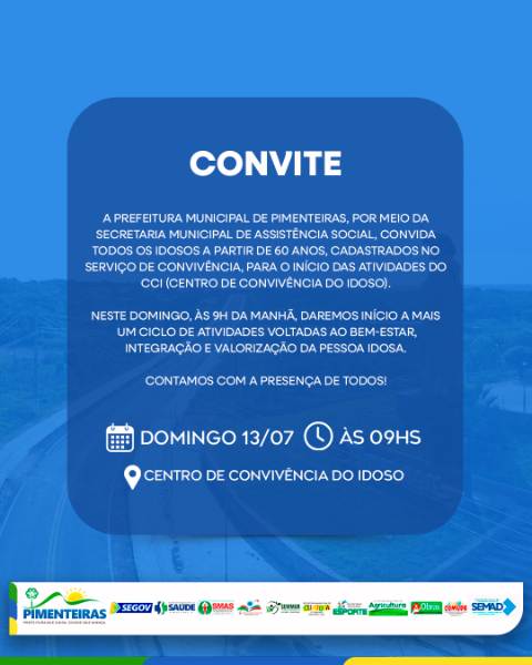 Data: 11/07/2025A Prefeitura Municipal de Pimenteiras, por meio da Secretaria Municipal de Assistência Social, convida todos os idosos a partir de 60 anos, que estão cadastrados no Serviço de Convivência, para o início das atividades do CCI (Centro de Convivência do Idoso). Neste domingo, a partir das 9h da manhã, estaremos dando início a mais um ciclo de momentos especiais, com acolhimento, alegria e muitas atividades pensadas especialmente para vocês! Contamos com a presença de todos no CCI!