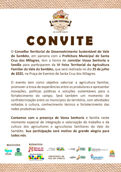 Data: 01/08/2025O município de Pimenteiras marcará presença na VI Feira Territorial da Agricultura Familiar do Vale do Sambito, que acontecerá no dia 25 de julho de 2025, na Praça de Eventos de Santa Cruz dos Milagres.