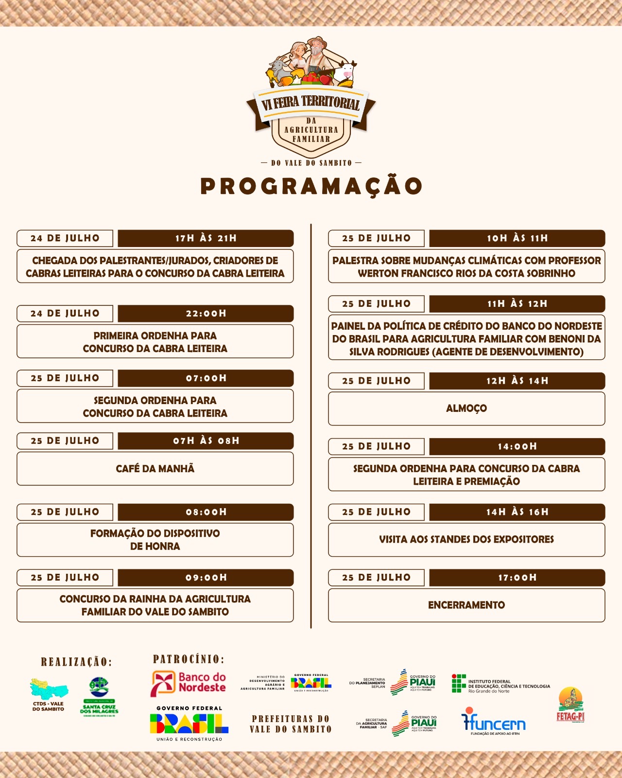 A Feira é promovida pelo Conselho Territorial de Desenvolvimento Sustentável do Vale do Sambito, em parceria com os municípios do território, e tem como objetivo valorizar a agricultura familiar, promover a troca de experiências entre produtores e apresentar inovações, políticas públicas e soluções sustentáveis para o fortalecimento do campo.