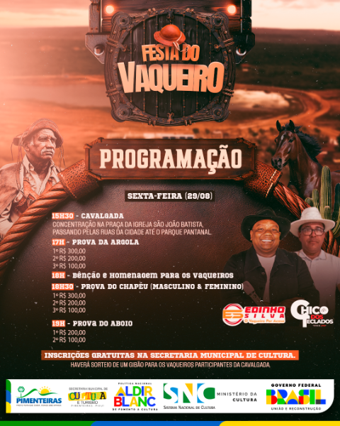 A programação começa com a cavalgada às 15h30, seguida das provas de argola, chapéu e aboio. Teremos ainda bênção e homenagem aos vaqueiros, além de apresentações de Edinho Silva e Chico dos Teclados.
