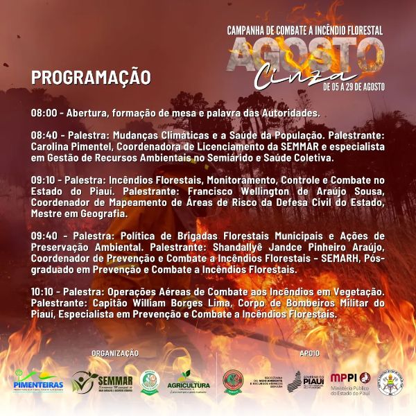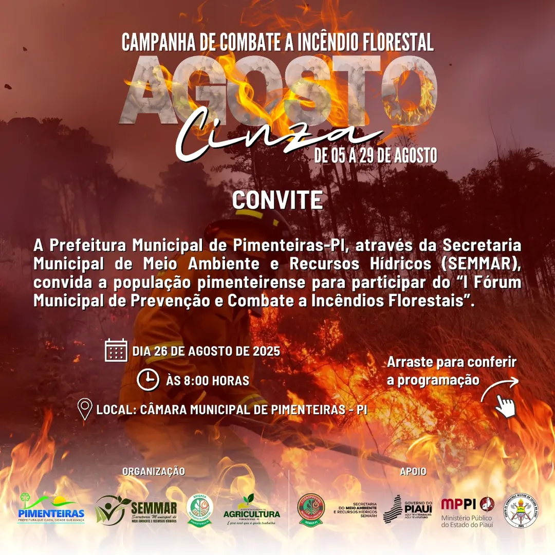 Data: 25/08/2025A Prefeitura Municipal de Pimenteiras-PI, através da Secretaria Municipal de Meio Ambiente e Recursos Hídricos (SEMMAR), tem a honra de convidar toda a população pimenteirense para participar do “I Fórum Municipal de Prevenção e Combate a Incêndios Florestais”. Data: 26 de agosto Horário: a partir das 8h da manhã Local: Câmara Municipal de Pimenteiras Contamos com a sua presença!
