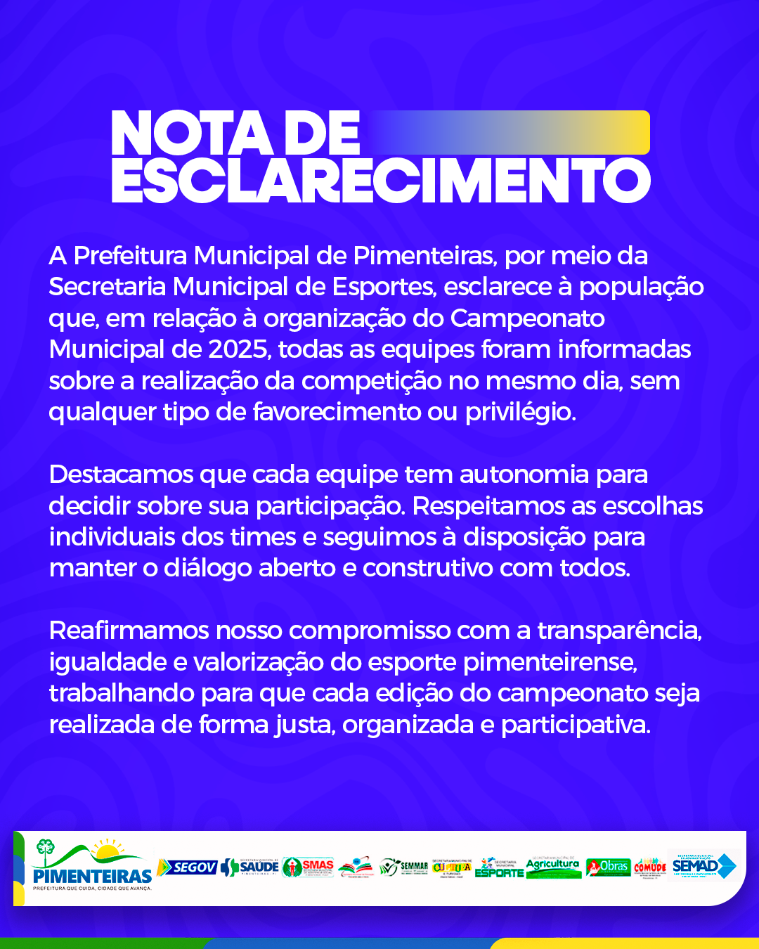Data: 01/10/2025A Prefeitura de Pimenteiras, por meio da Secretaria de Esportes, reforça que todas as equipes foram informadas sobre o Campeonato Municipal 2025 no mesmo dia, sem privilégios. Nosso compromisso é com a transparência, a igualdade e a valorização do esporte pimenteirense.