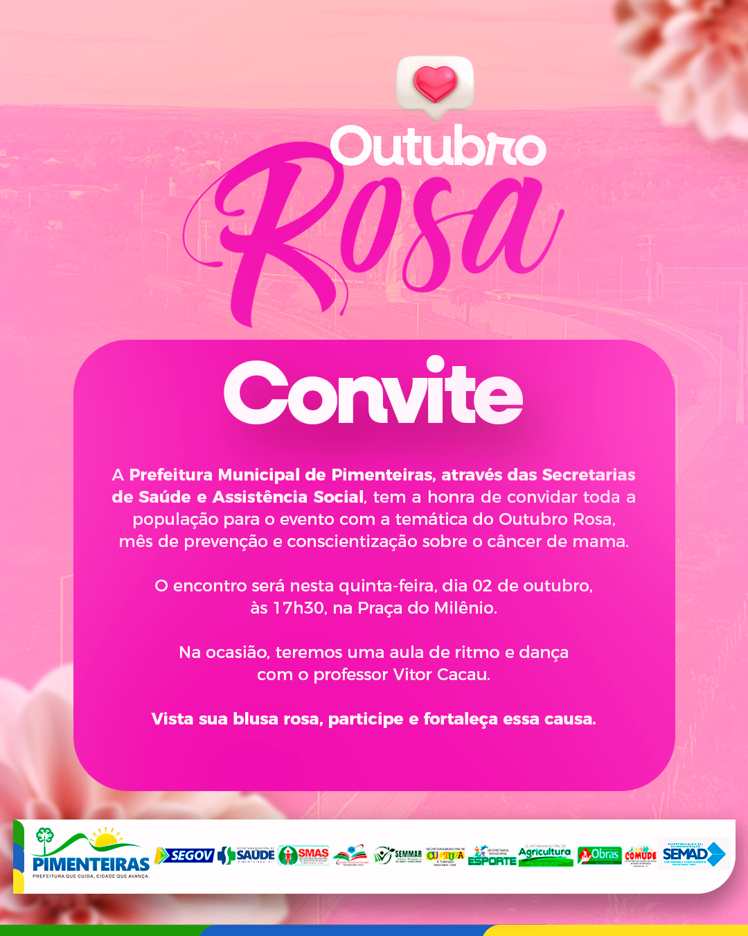 Data: 01/10/2025No dia 2 de outubro, às 17h30, na Praça do Milênio, teremos um encontro especial com aula de ritmo e dança com o professor Vitor Cacau.
