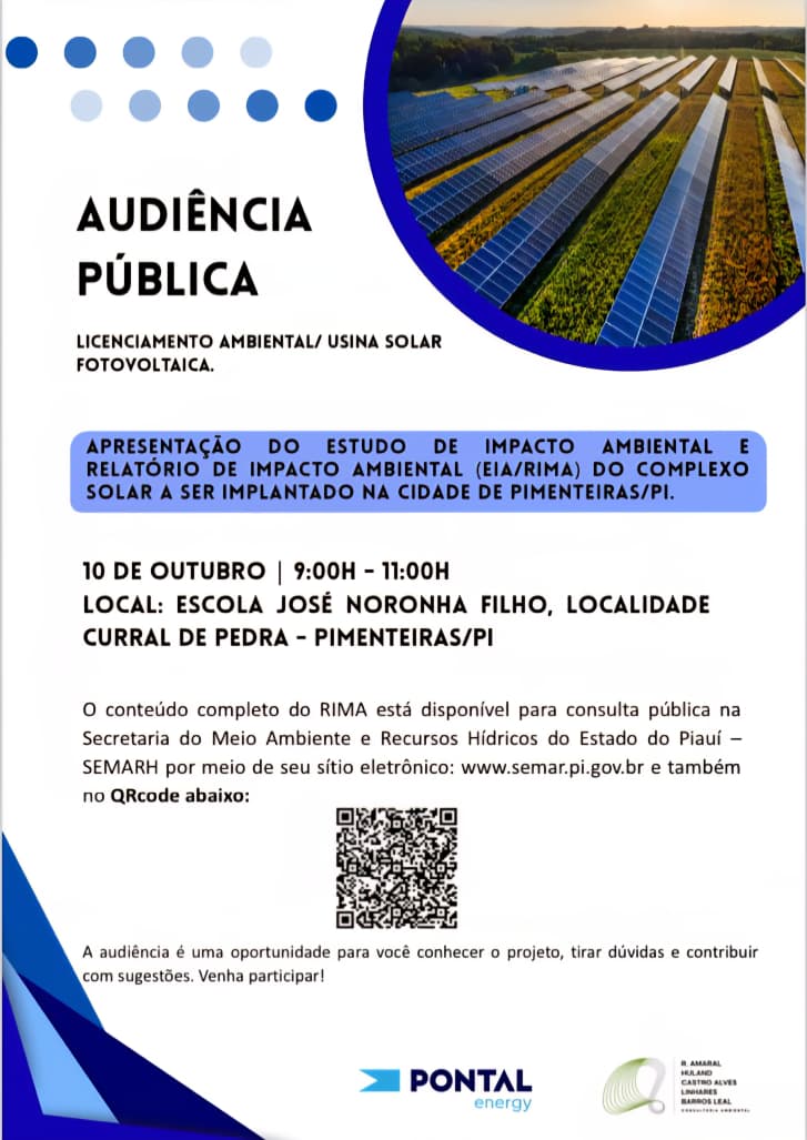 Data: 08/10/2025Será realizada no dia 10 de outubro, das 9h às 11h, na Escola José Noronha Filho, localizada na comunidade Curral de Pedra – Pimenteiras/PI, a Audiência Pública para apresentação do Estudo e Relatório de Impacto Ambiental (EIA/RIMA) referente ao Complexo Solar Fotovoltaico previsto para ser implementado no município de Pimenteiras-PI.