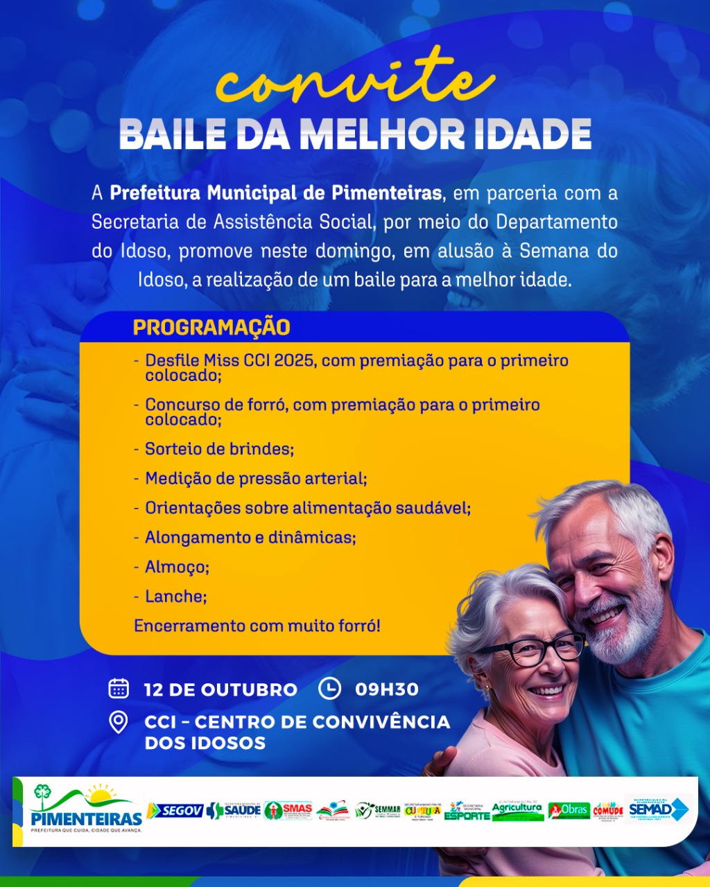 Data: 16/10/2025A Prefeitura Municipal de Pimenteiras, em parceria com a Secretaria de Assistência Social, convida todos os idosos para um baile especial em homenagem à Semana do Idoso.