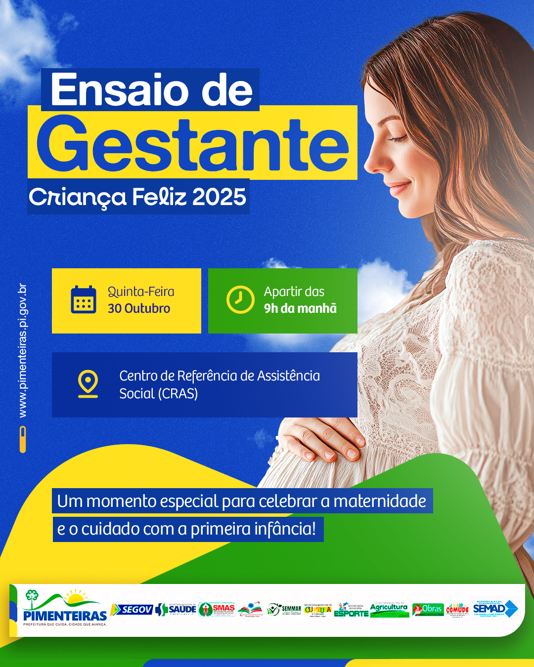 Data: 24/10/2025A Prefeitura de Pimenteiras, por meio do Programa Criança Feliz e em parceria com a Secretaria Municipal de Assistência Social, realiza o Ensaio de Gestante – Criança Feliz 2025.