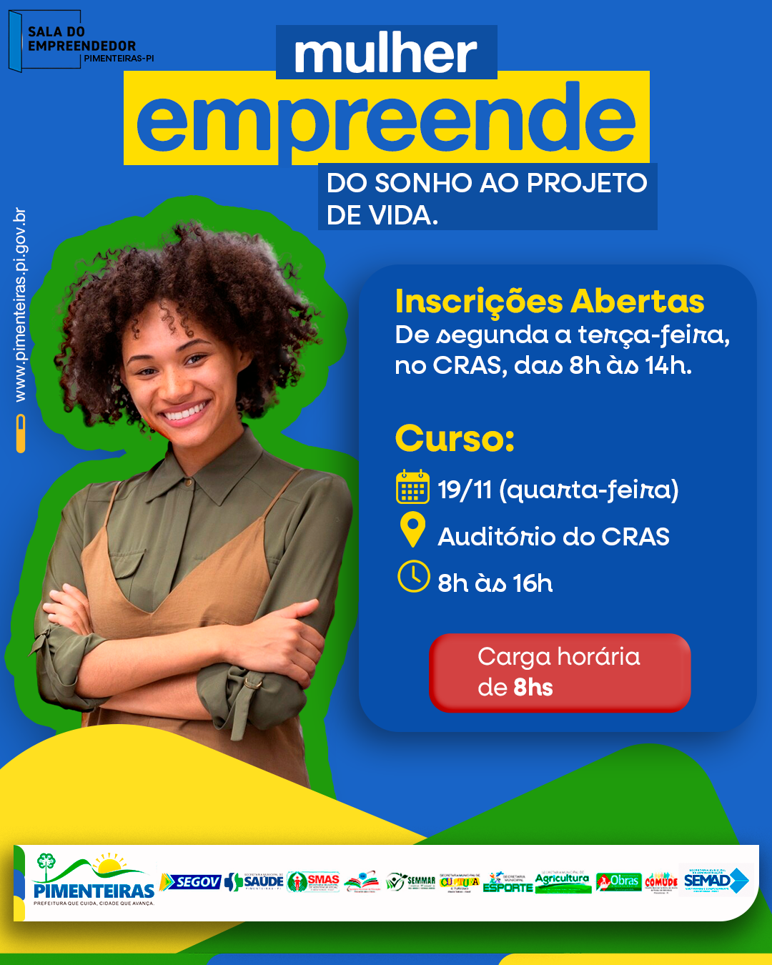 Data: 18/11/2025Uma nova oportunidade chega para as mulheres de Pimenteiras. Estão abertas as inscrições da primeira turma do programa Mulher Empreende, uma iniciativa voltada para capacitação, autonomia e desenvolvimento pessoal.