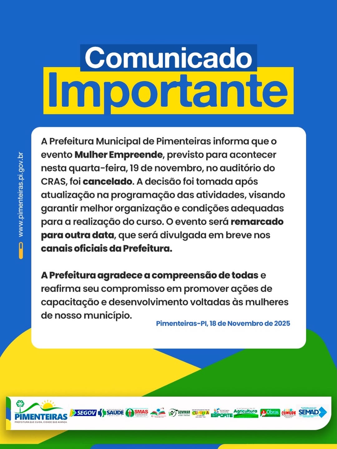 Data: 20/11/2025A Prefeitura Municipal de Pimenteiras informa que o evento Mulher Empreende, previsto para acontecer nesta quarta-feira, 19 de novembro, no auditório do CRAS, foi cancelado.