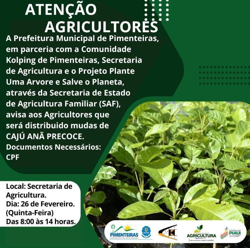 A Prefeitura Municipal de Pimenteiras, em parceria com a Comunidade Kolping, Secretaria de Agricultura e o Projeto Plante Uma Árvore e Salve o Planeta, por meio da Secretaria de Estado da Agricultura Familiar (SAF), informa: