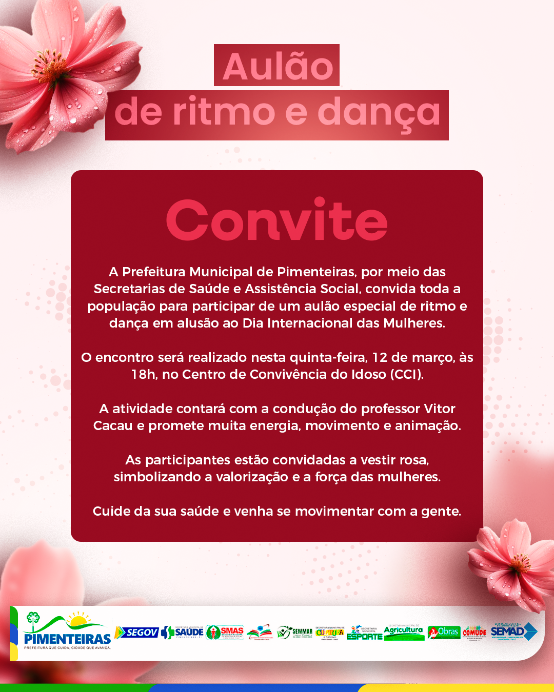A Prefeitura de Pimenteiras convida toda a população para participar de um aulão especial de ritmo e dança, realizado em alusão ao Dia Internacional das Mulheres. A iniciativa é promovida por meio das Secretarias de Saúde e Assistência Social e busca incentivar o bem-estar, a prática de atividades físicas e a integração da comunidade.
