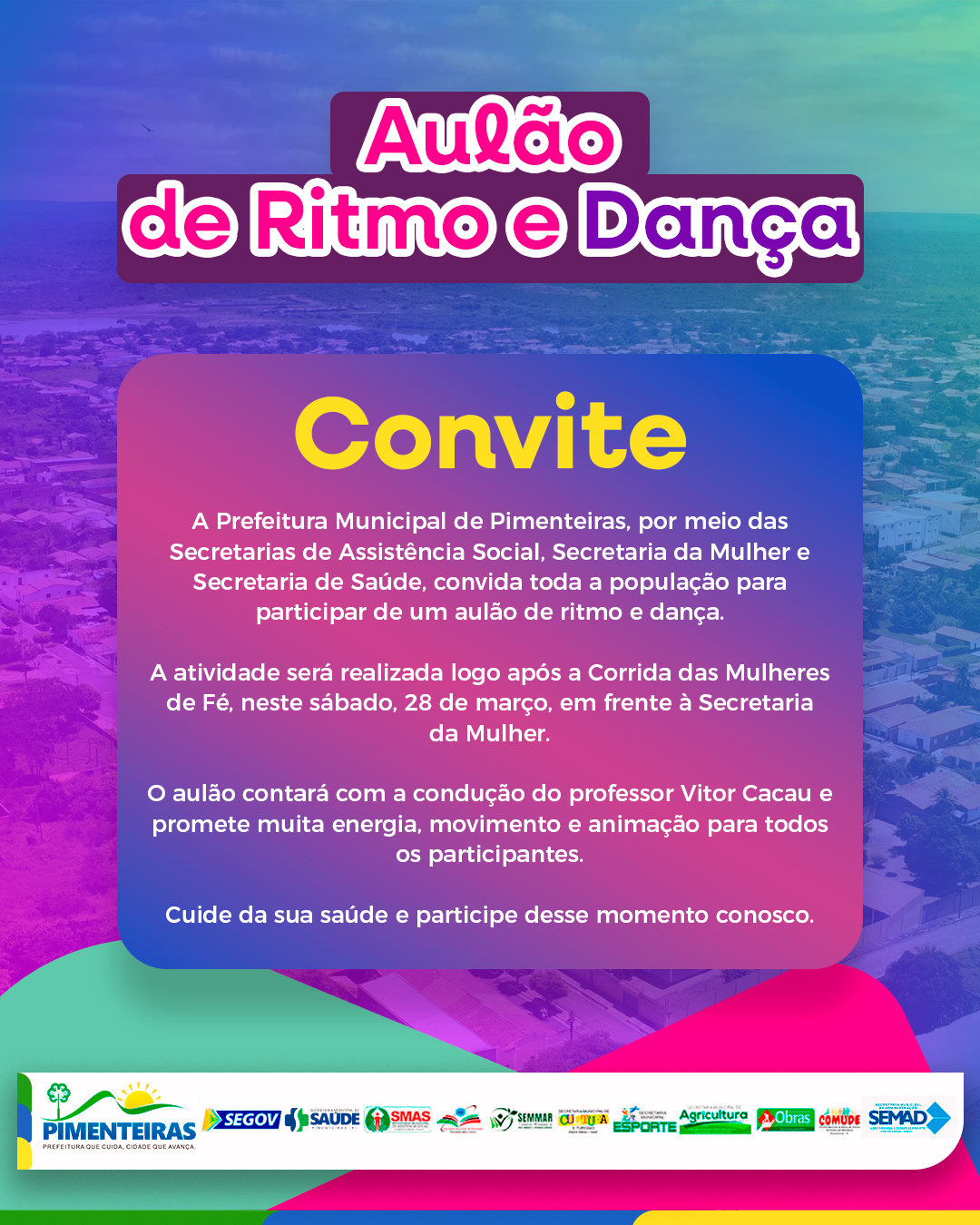 Data: 25/03/2026A Prefeitura de Pimenteiras convida toda a população para participar desse super aulão de ritmo e dança, promovido pelas Secretarias de Assistência Social, Secretaria da Mulher e Secretaria de Saúde