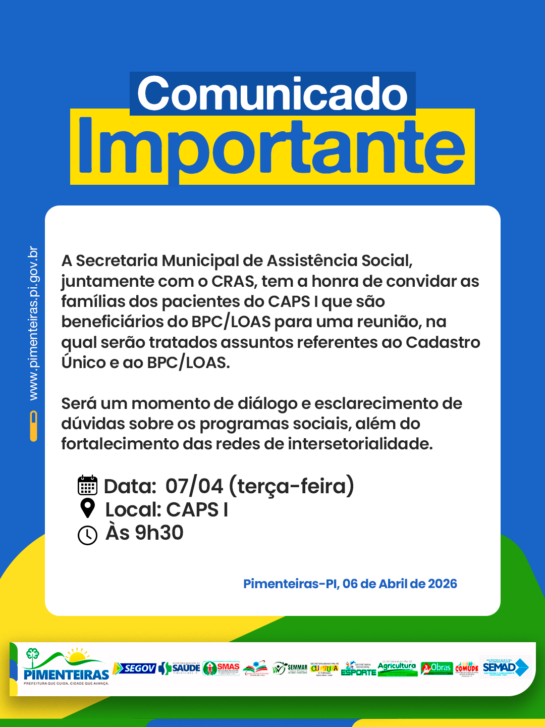 Data: 08/04/2026A Prefeitura de Pimenteiras, por meio da Secretaria Municipal de Assistência Social e do CRAS, convida as famílias dos pacientes do CAPS I que são beneficiários do BPC/LOAS para uma reunião importante.