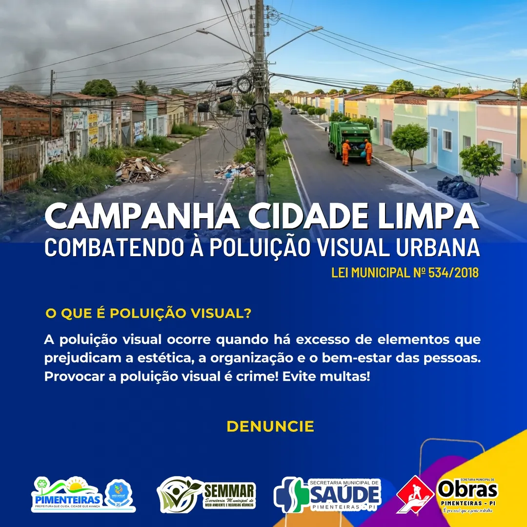 A Prefeitura de Pimenteiras realiza, de 13 a 17 de abril, a Campanha Cidade Limpa, por meio das Secretarias de Meio Ambiente, Obras e Saúde, com o objetivo de conscientizar a população sobre os impactos da poluição visual e a importância de manter a cidade organizada.
