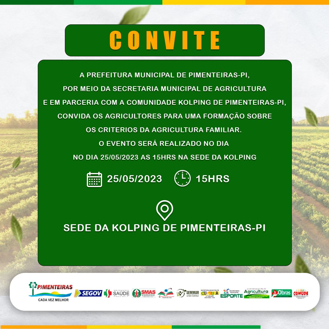 Data: 16/05/2023A Prefeitura Municipal de Pimenteiras-PI, por meio da Secretaria Municipal de Agricultura e parceria com a Comunidade Kolping de Pimenteiras, convida os agricultores para uma formação sobre os critérios da agricultura familiar.