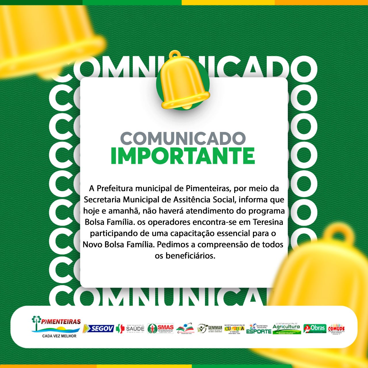 Data: 30/05/2023A Prefeitura Municipal de Pimenteiras, por meio da Secretaria de Assistência Social, informa que hoje e amanhã (30 e 31/05), não haverá atendimento no programa Bolsa Família.