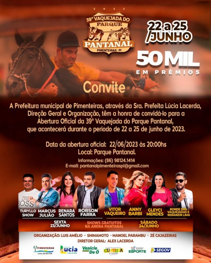 Data: 22/06/2023E o dia, finalmente, chegou! Acontece nesta quinta-feira (22/06), a partir das 20h, a cerimônia de abertura da 39ª Vaquejada do Parque Pantanal de Pimenteiras - PI. A vaquejada, que será realizada de 22 a 25 de junho, é uma das mais tradicionais do Piauí e figura entre as maiores, não somente do estado, mas de todo o Nordeste.