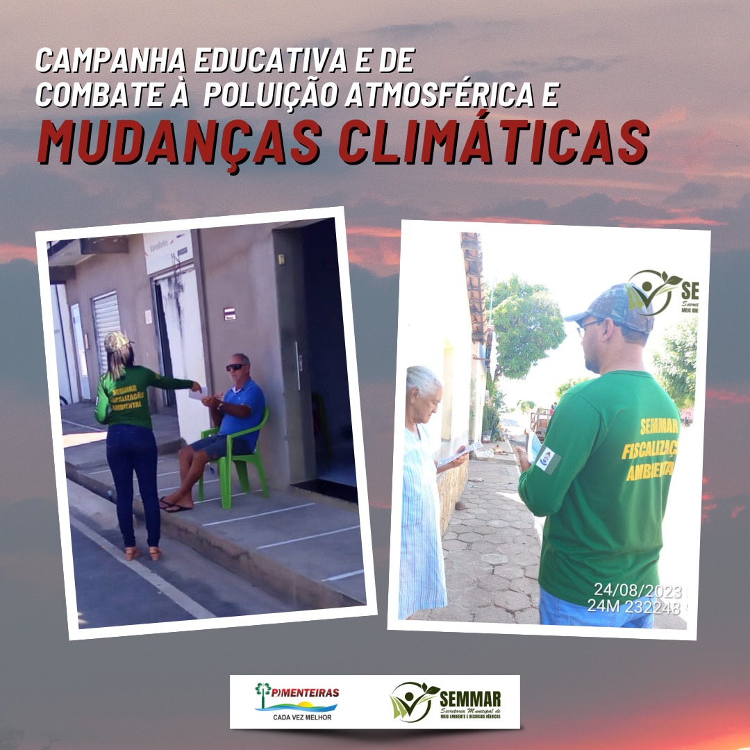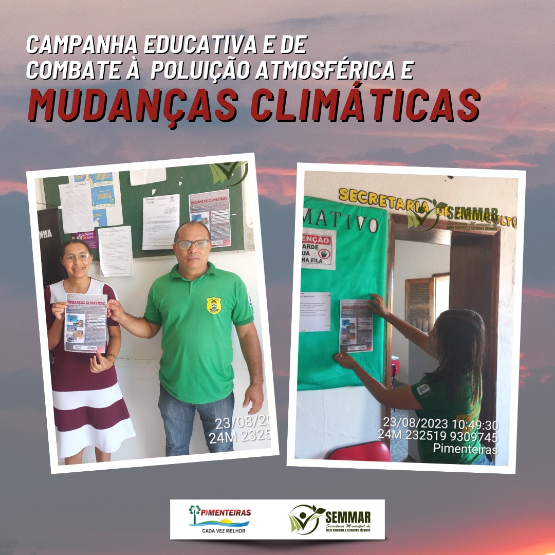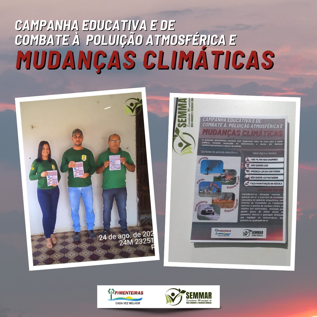 Data: 24/08/2023O município de Pimenteiras, através da Secretaria Municipal de Meio Ambiente e Recursos Hídricos-SEMMAR, iniciou nessa quarta-feira (23/08) a "Campanha Educativa e de Combate A Poluição Atmosférica E Mudanças Climáticas", foram realizadas ações de colagem de cartazes informativos nos órgãos públicos do município, destacando as principais causam e consequências da poluição atmosférica. Já nessa quinta-feira (24/08) foi dado continuidade a campanha com panfletagem nas ruas da cidade.