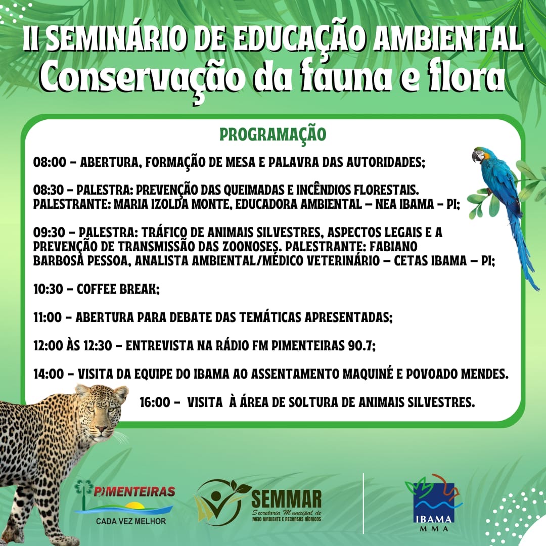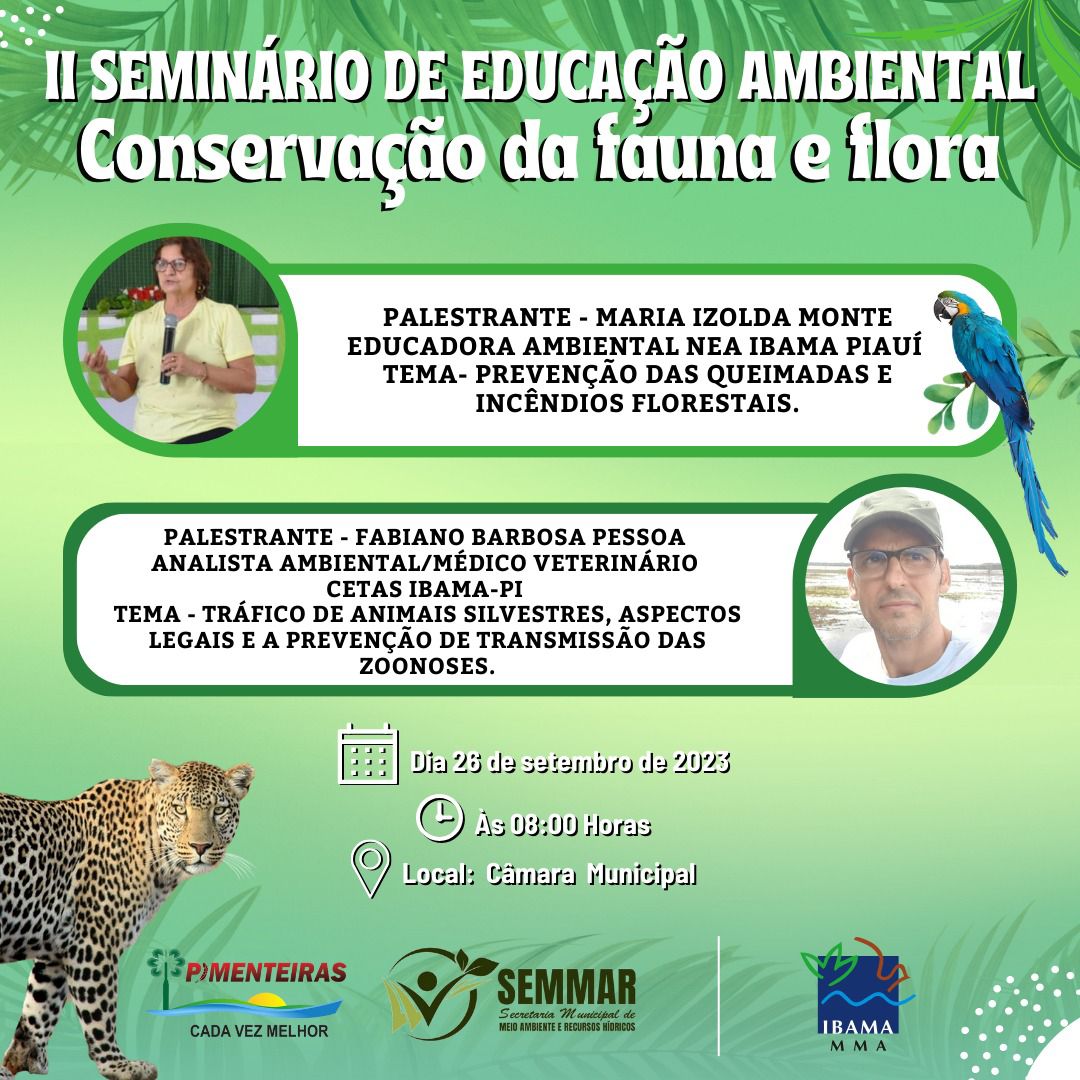 Data: 23/09/2023A Prefeitura de Pimenteiras, através de sua Secretaria de Meio Ambiente e Recursos Hídricos (SEMMAR) em parceria com o IBAMA-PI, convida a todos os cidadãos de Pimenteiras e região a participarem do II Seminário de Educação Ambiental, com o tema: "Conservação da Fauna e Flora".