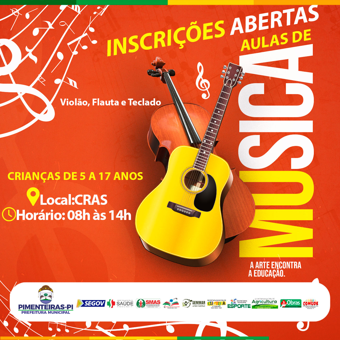 Data: 20/02/2024A Prefeitura Municipal de Pimenteiras, através de sua Secretaria de Assistência Social e Centro de Referência de Assistência Social (CRAS), abre inscrições a crianças e adolescentes interessados em participar do mundo da música.