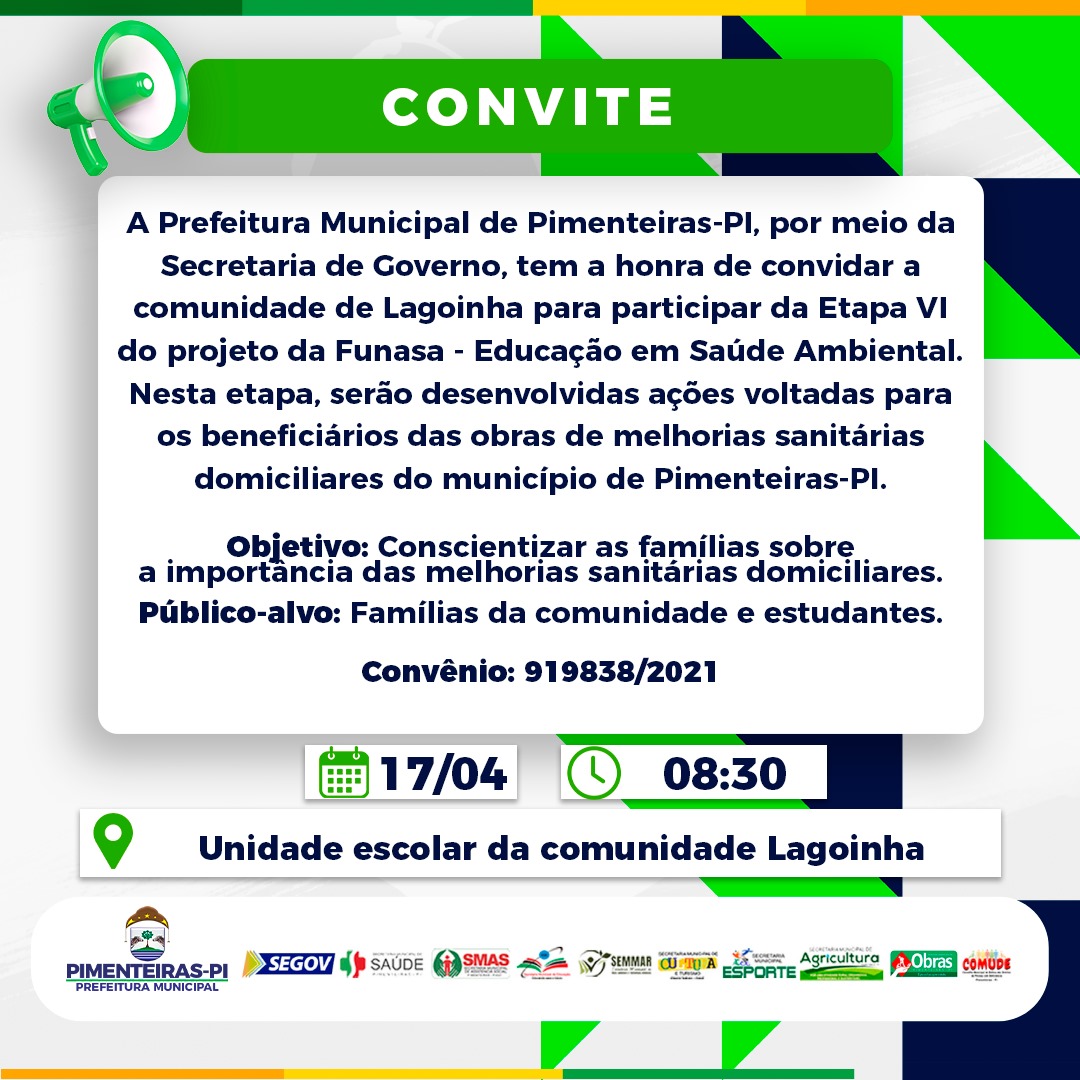 Venha se juntar a nós na Escola Municipal da Localidade Lagoinha em 17/04/2024, às 08:30min. Destinado a famílias da comunidade e estudantes, nosso objetivo é conscientizar sobre a importância das melhorias sanitárias domiciliares. Junte-se a nós por um ambiente mais saudável!