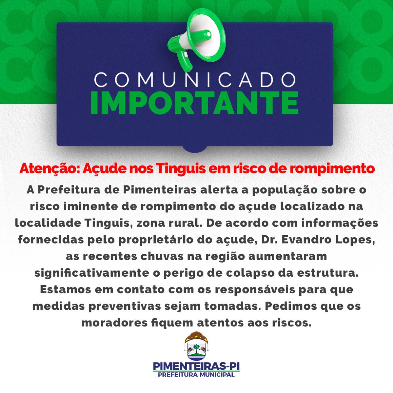Atenção Moradores de Pimenteiras quanto ao Risco de Rompimento da Barragem dos Tinguis