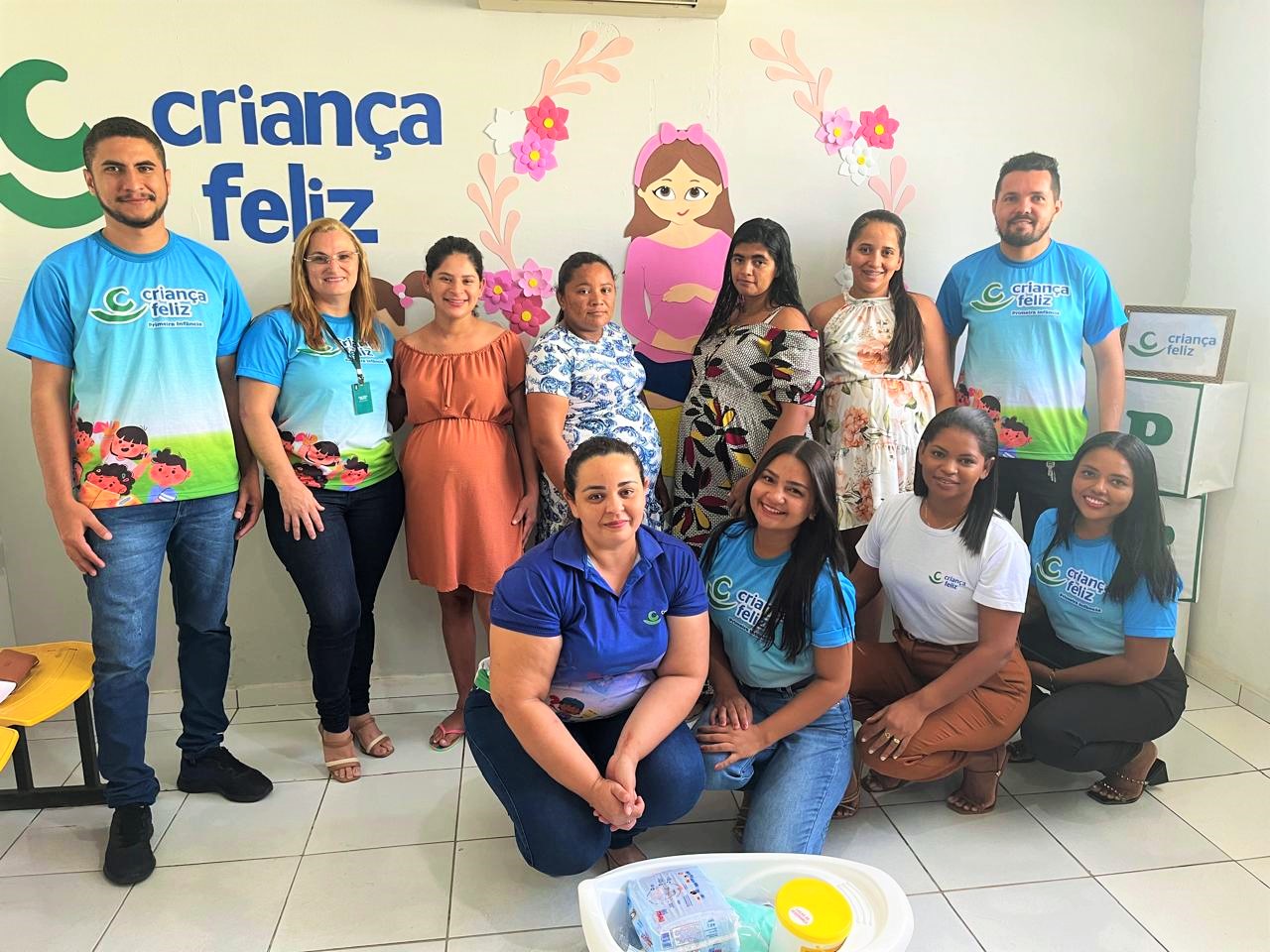 O time do Programa Criança Feliz estava presente com todos os seus seis visitadores e sua coordenadora, que estão atendendo atualmente 38 gestantes, com entrega desta vez de seis kits de gestantes. Para ter acesso a um kit destes, você gestante deve fazer a solicitação no CRAS ou na Secretaria da Assistência Social, informe-se sobre como solicitar o enxoval e siga as orientações dadas. No próximo mês, em julho, serão formados novos grupos de gestantes.
